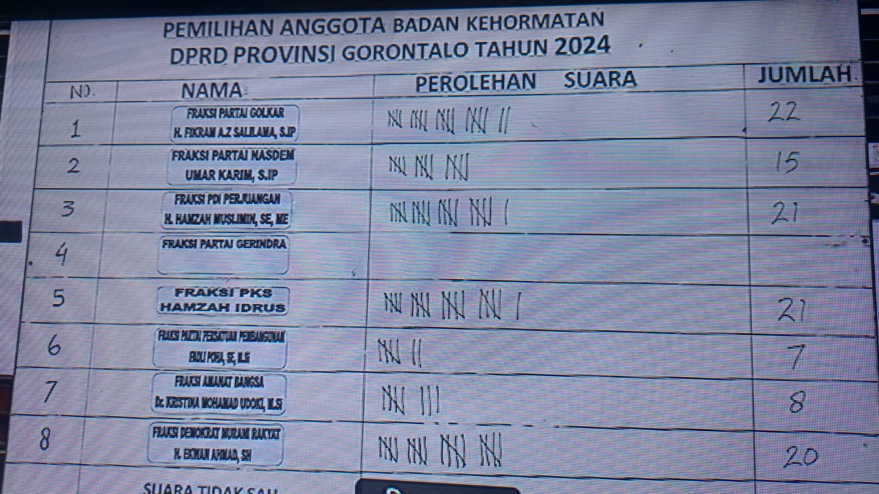 Winnet, Gorontalo – Dalam Rapat Paripurna ke-6 yang digelar Jumat, 1 November 2024, di Gedung DPRD Provinsi Gorontalo, dilakukan pemilihan anggota Badan Kehormatan DPRD Provinsi Gorontalo melalui mekanisme voting.