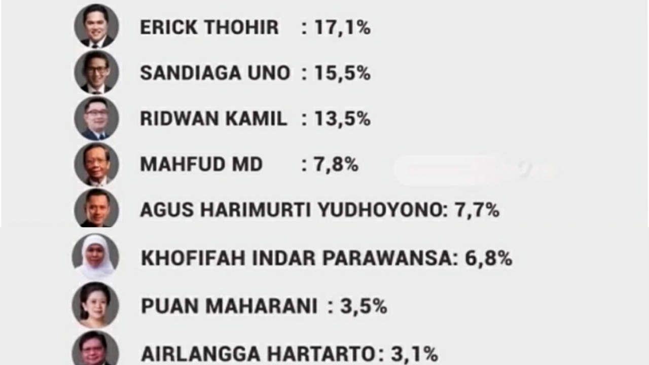 Sementara dari hasil survei Indikator, pada periode 26 hingga 30 Mei 2023, menampilkan beberapa nama teratas sebagai calon wakil presiden, yaitu Erick Thohir, Ridwan Kamil, dan Mahfud MD, disusul Sandiaga Uno dan Agus Harimurti Yudhoyono yang berada diperingkat keempat dan kelima.