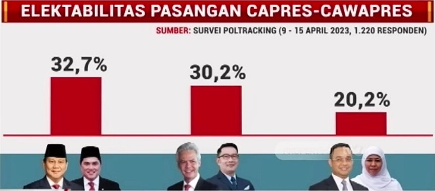 Disisi lain, lembaga survei Poltracking mencoba memasangkan calon presiden dan wakil presiden pilihan masyarakat, dan melakukan survei kepada 1.220 responden, pada 9 hingga 15 april 2023.